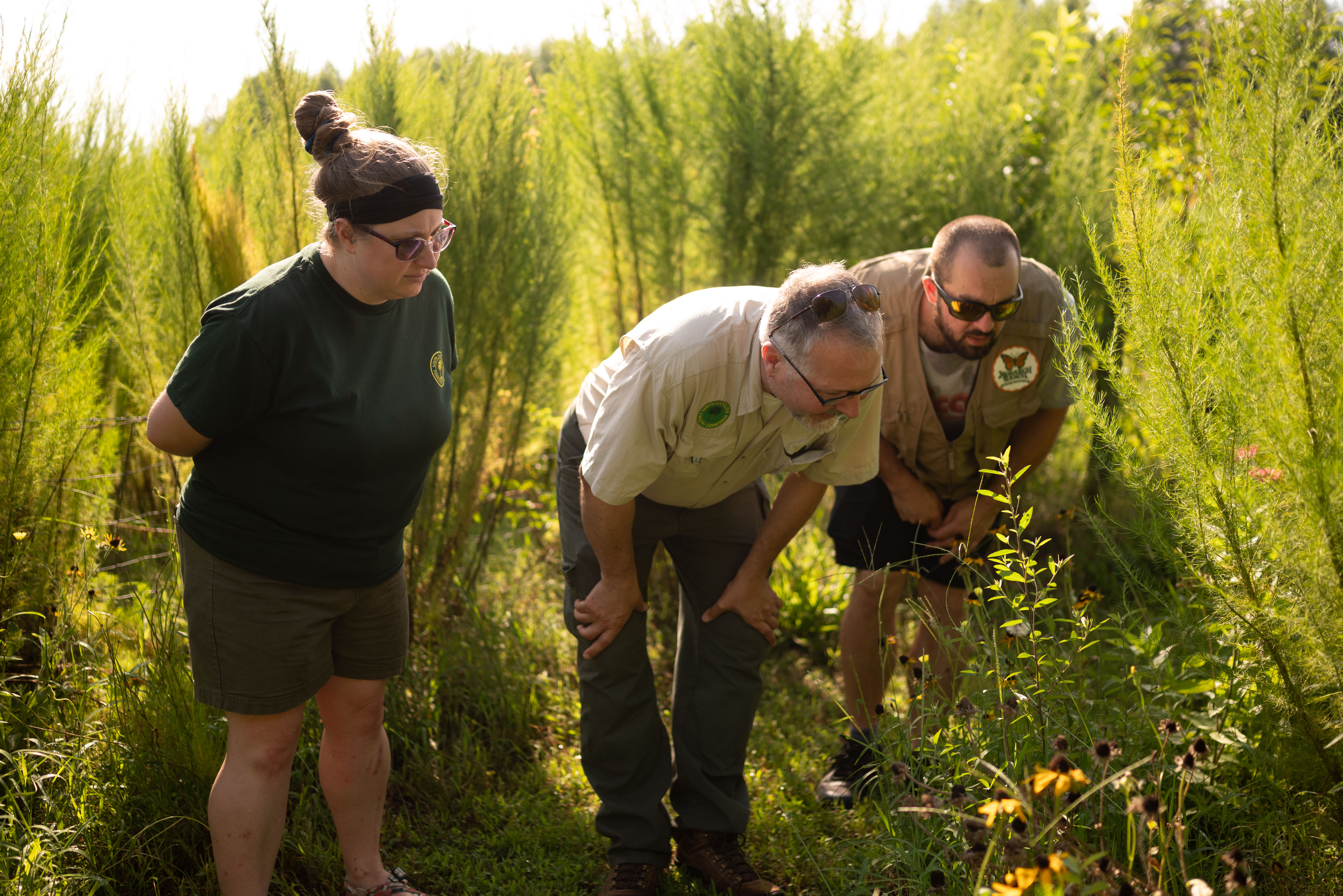 Lead educator, Sean Reid, with David and Katie from the South Carolina Forestry Commission, observing an insect at Monarch Ranch Butterfly Conservatory.